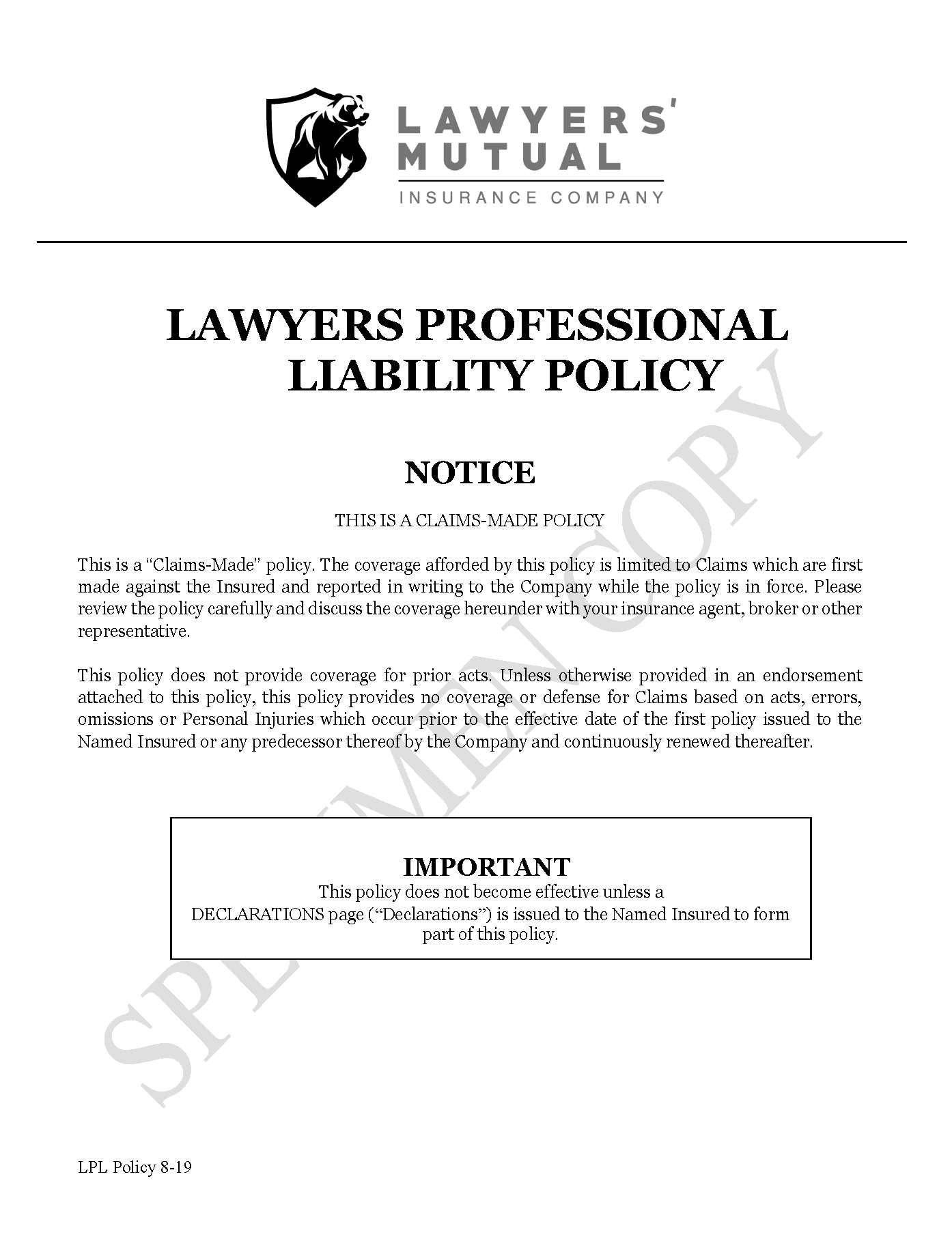 Lawyers Mutual Insurance Company LPL Specimen Policy Page 1